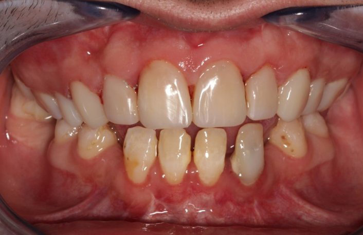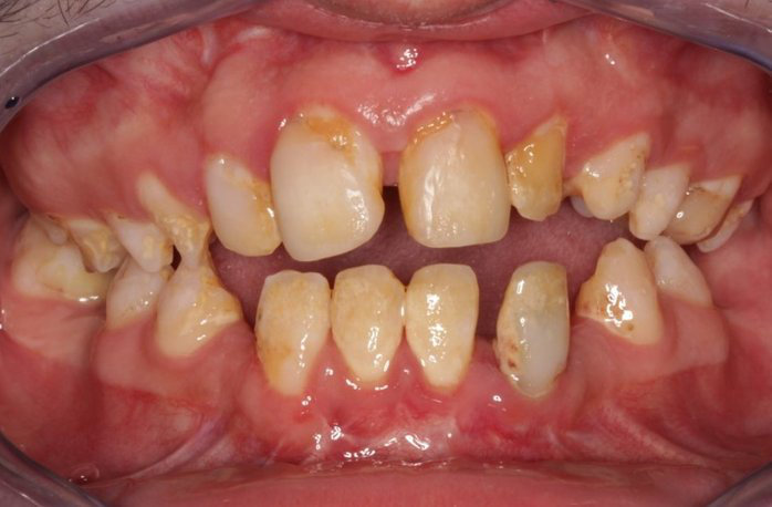 Hier zien we het rough hypoplastic type bij een jongen van 18 jaar. De hoektanden braken niet vanzelf door. Deze zijn op zeer jonge leeftijd chirurgisch verwijderd. De verzorging van zijn gebit laat zeer te wensen over. Zijn tandvlees is ongezond, hij heeft vullingen en is door invasieve behandeling waarbij aangedaan glazuur verwijderd werd en eigen verwaarlozing ook een paar kiezen kwijt geraakt.