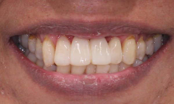 Deze mevrouw verloor (jaren geleden) haar beide voortanden door een klap in het gezicht. Ze had een plaatje gekregen dat niet lekker zat en niet voldeed aan de esthetische wensen. Implantologie zou in haar geval een gecompliceerd en duur traject worden. Af en toe maakte ze zelf iets wat ze in haar mond droeg om het gat te verbergen.